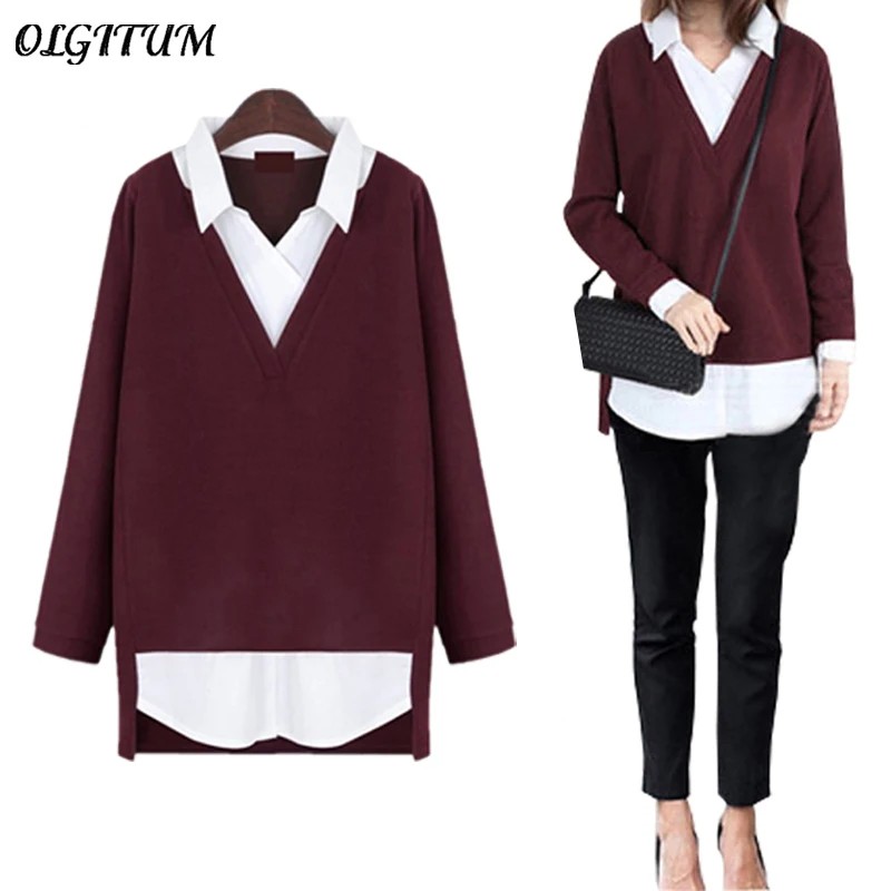 2018 New Women tops Fake two-piece shirt turn-down collar sweater slim fashion clothing women sweater plus size 5XL