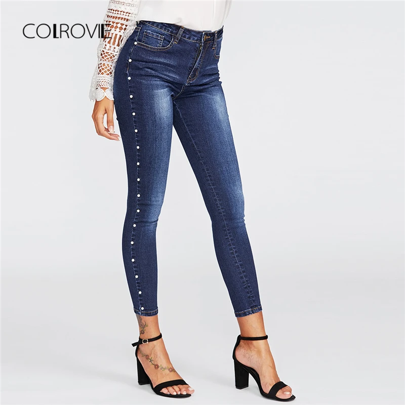Offer Description of COLROVIE 2018 Spring Skinny Pearl Beading Faded Wash Jeans Blue Mid Waist Zipper Fly Plain Denim Jeans Women Casual Trousers