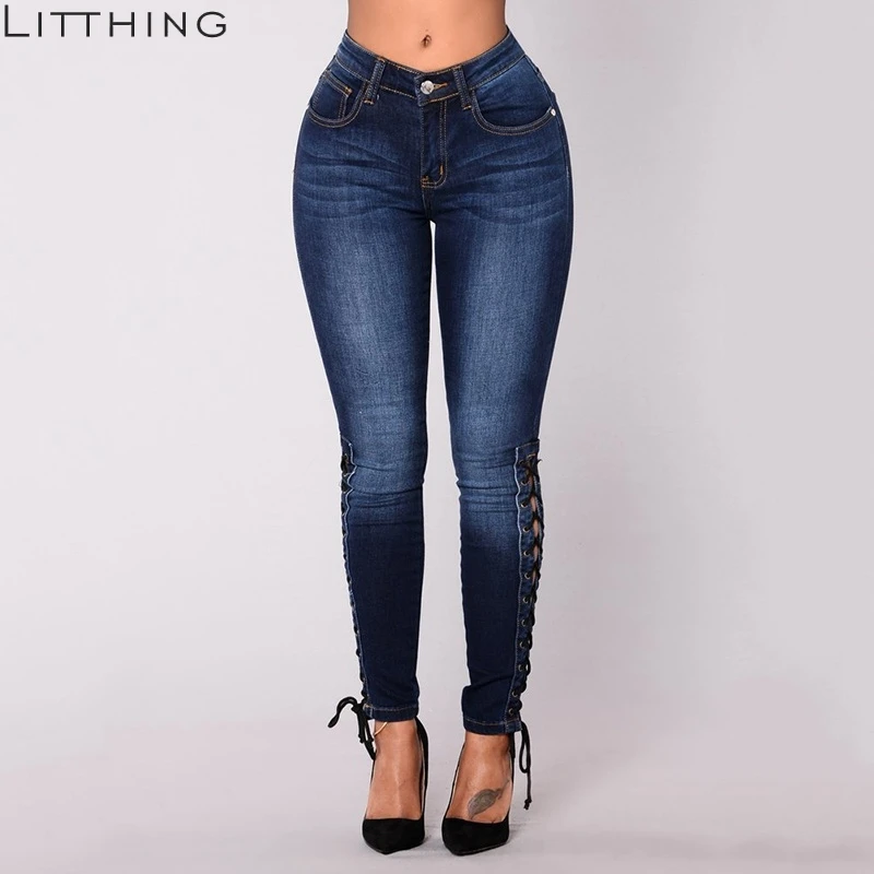 Good Price of LITTHING Women Jeans Lace Up Hole Tight Ripped Autumn Womens Fashion Hollow Out Cross Strap Bandage Pencil Pants Sexy 2018 Jeans