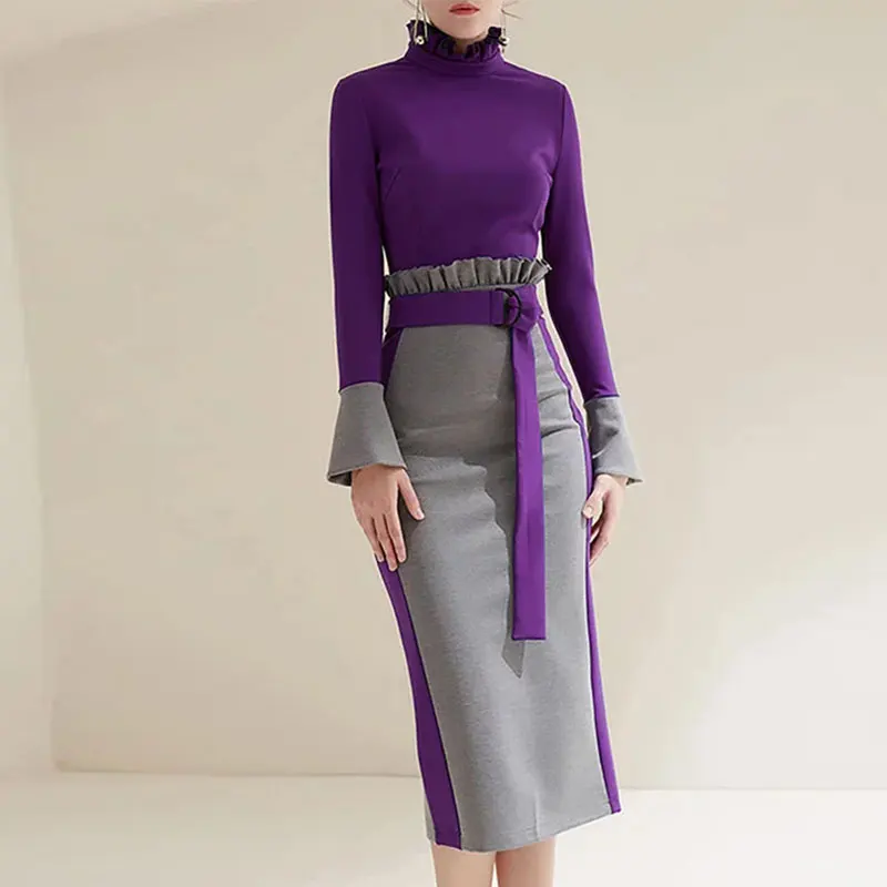 Multiflora 2018 formal dress women elegant purple long sleeve ruffle turtle neck offcie dress winter empire bodycon women dress