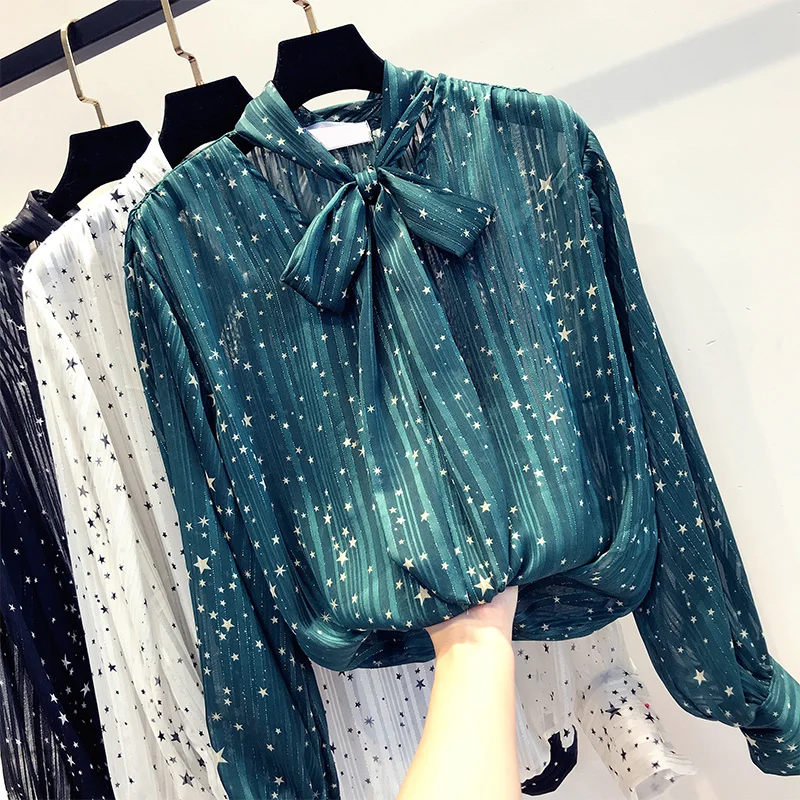 Chance Description for MUMUZI Women OL Stars Print Women Blouse Chiffon Casual Loose Long Sleeve Shirt Tops Female Elegant Hollow out Tops Blouses