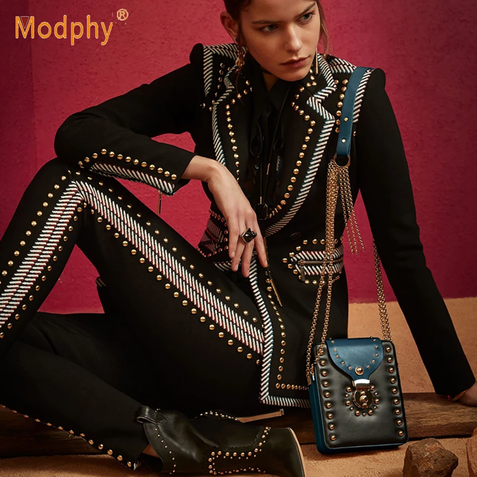 If You will buy for Women Suit sets, then Winter black two-piece long-sleeved V-neck rivet blazer and high-waist pants casual women's suit celebrity runway party set is possible make you like