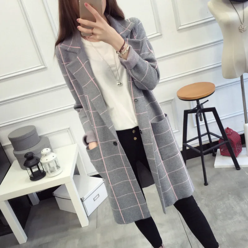 2018 New Autumn Winter High Quality Long Cardigan Women Sweater Long Sleeve Knitted Plaid Cardigans Female Tricot Tops