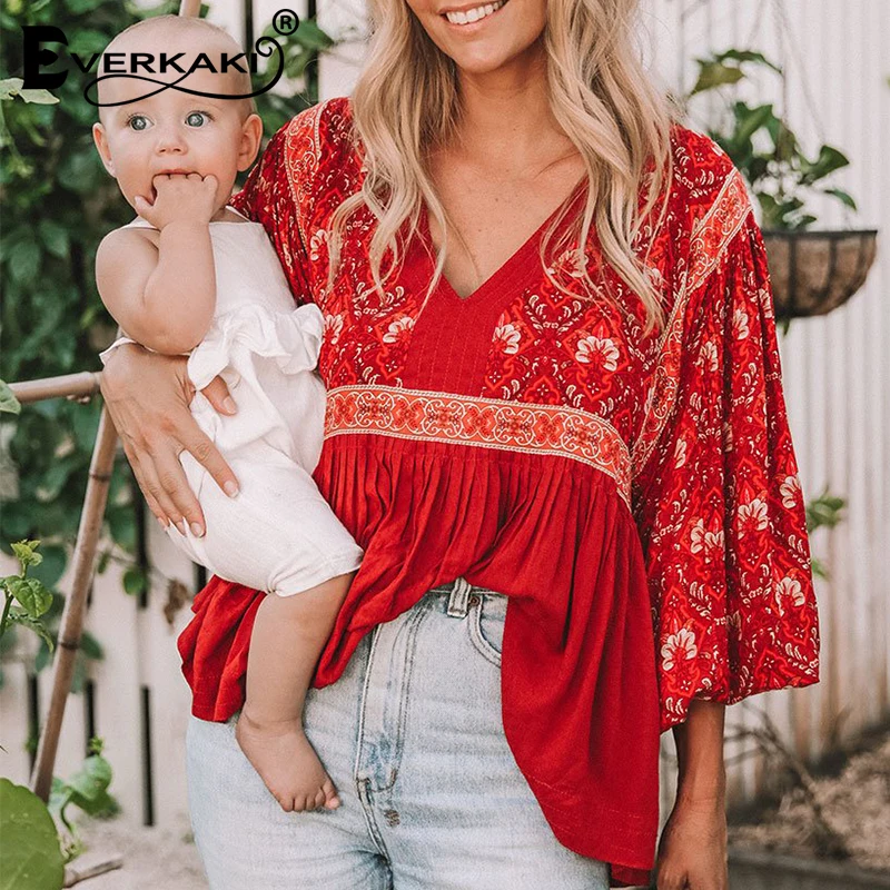 Offer Description for Everkaki Red Boho Blouse Shirt Peplum Top Long Sleeve Floral Print Cotton V Neck 2018 Bohemian Blouses Women Tops And Blouses