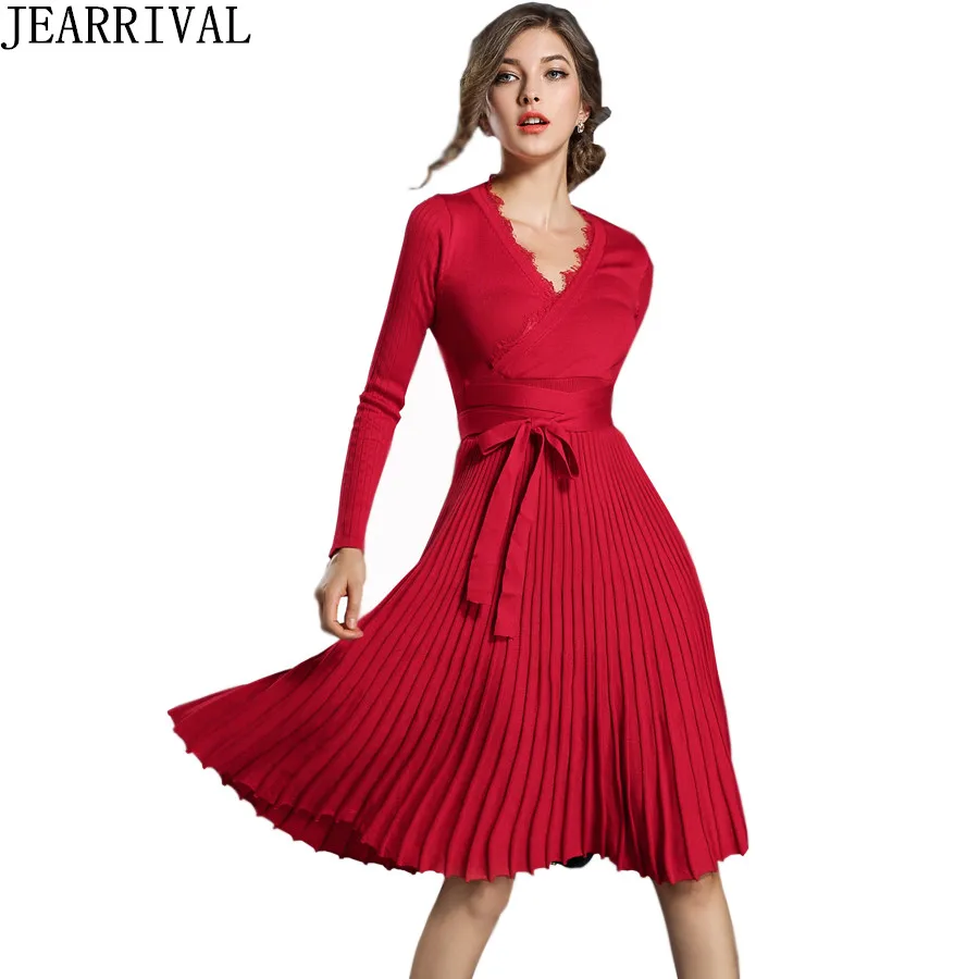 Gallery for Fashion Winter Dress 2018 New Women Elegant Long Sleeve Sexy Lace V-Neck Pleated Casual Sweater Knitted Dresses Vestido De Festa