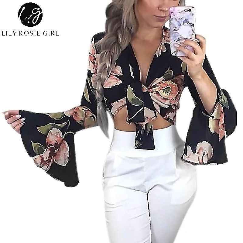 Offer Description for Lily Rosie Girl Bow Tie Crop Sexy Women Blouses Floral Print Long Flare Sleeve Short Shirts Boho Beach Black Shirt Ladies Blouse