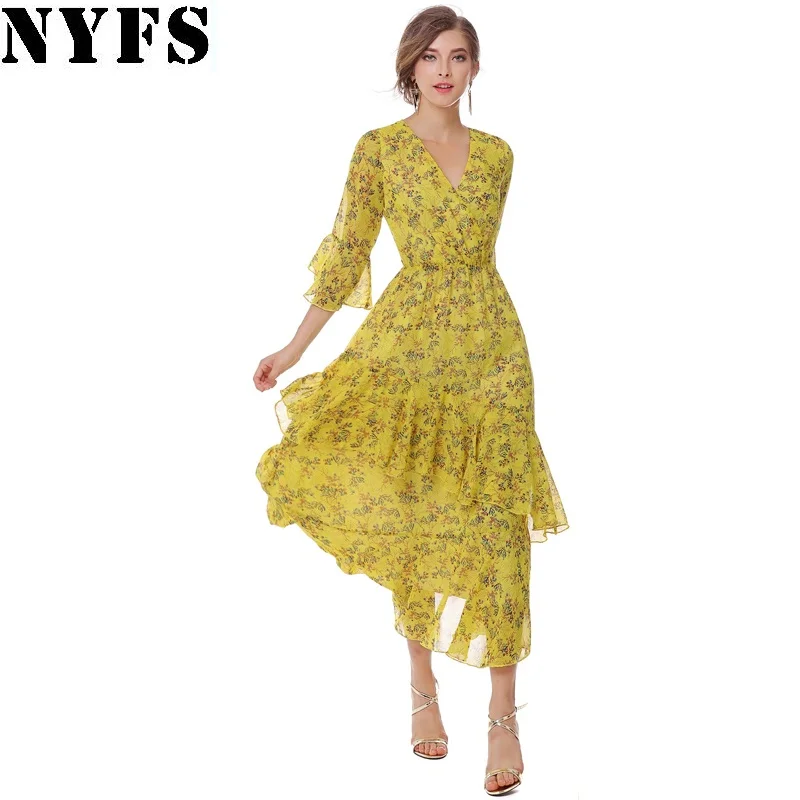 NYFS Printing Long dress V-neck irregular Lotus leaf Flare Sleeve Chiffon yellow floral Women dress Vestidos Robe Elbise