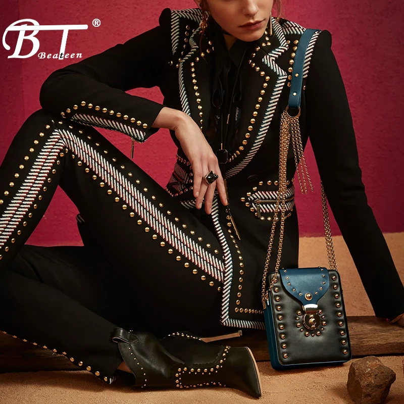 Good Offer for Beateen Black Blazer Pant Suits 2 Pieces Set Rivet Studded Zipper Fashion Women Formal OL Party