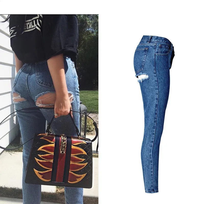 Addition Information of Super Sexy Butt Ripped Hole Jeans Slim Fit Women Jeans High Waist Exposed Hips Fashion Denim Women Boyfriend Skinny Jeans Femme